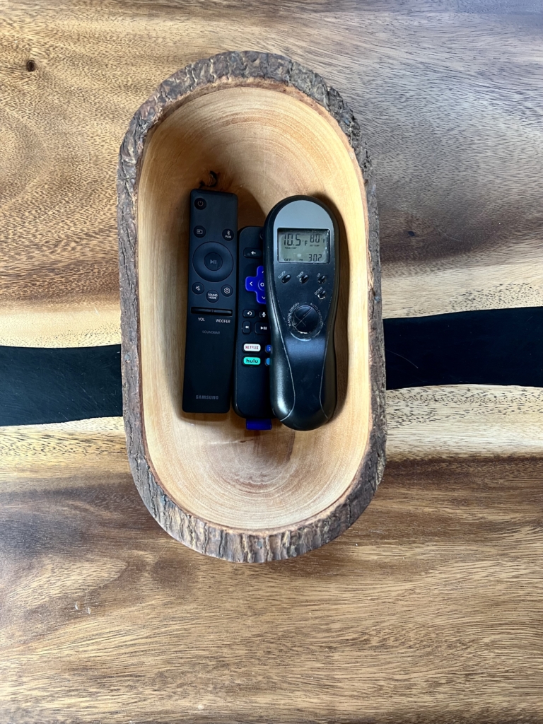 There’s a gas fireplace in the living room that’s perfect for cozy evenings. It’s operated by a remote located in the bowl on the coffee table. While the remote has several settings, the easiest way to use it is to simply power the fireplace on and off using the top-left button on the circular control in the center of the remote.